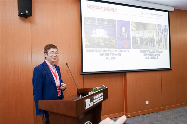 研究院工作汇报由院长贾伟平主持,执行院长吴家睿汇报。吴家睿汇报了过去一年里研究院在战略咨询、慢病管理、实验室建设、行业社群班建设、科学普及等领域的工作成果,并介绍了研究院未来将在数字化实验室建设、社会影响力建设、跨学科人才招募等方面的规划与展望。